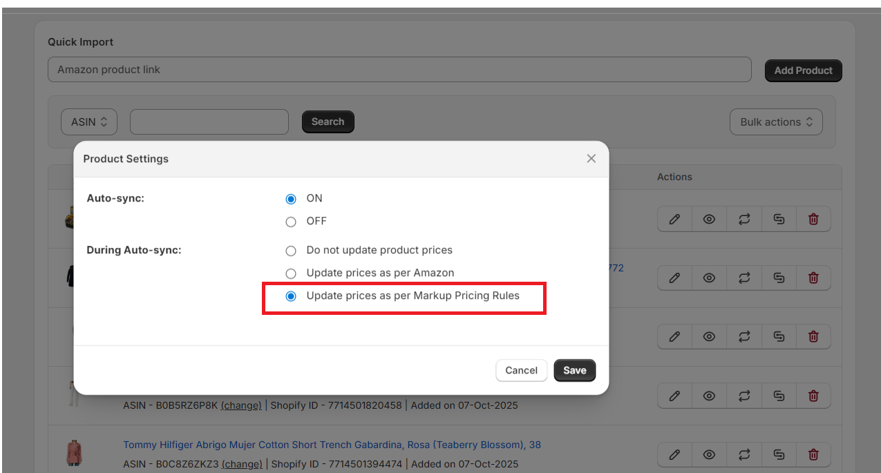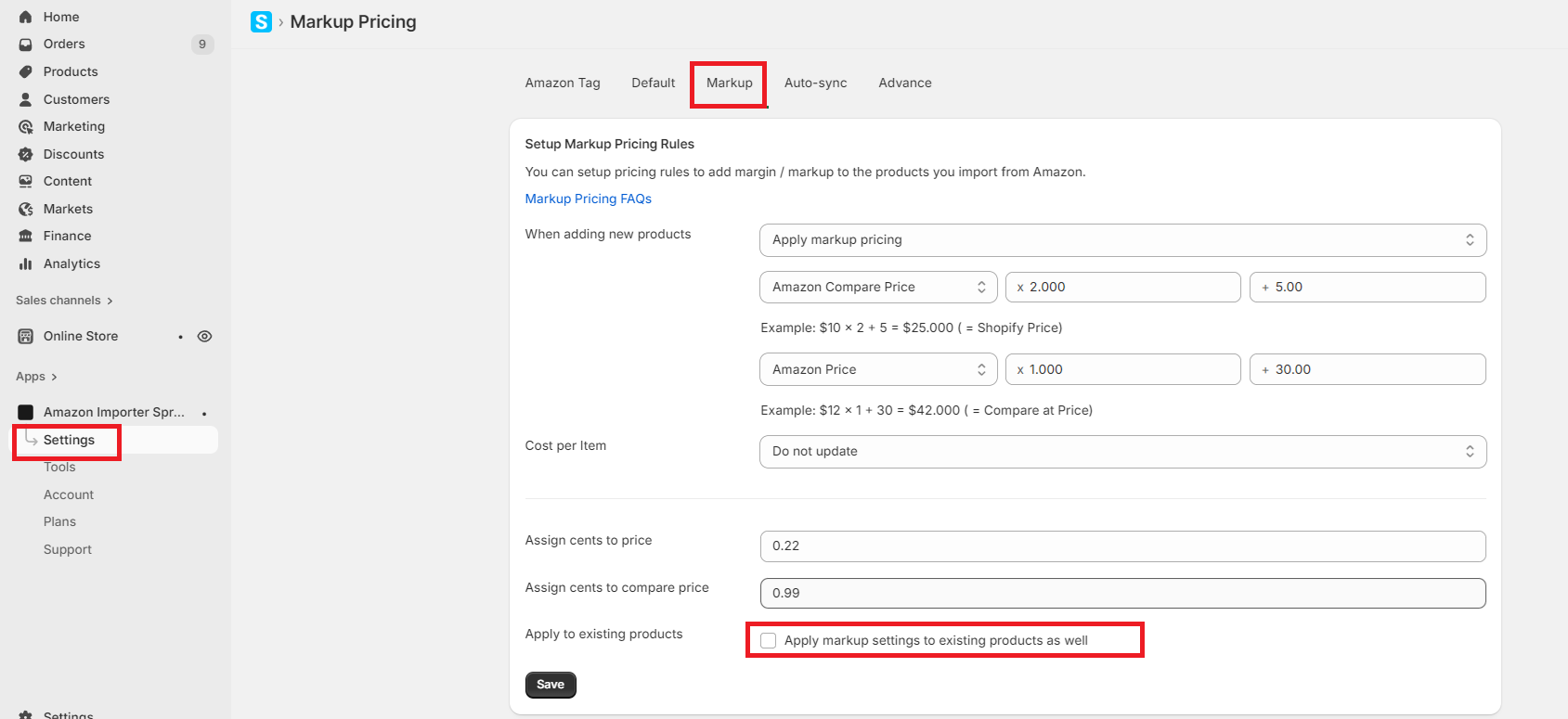On activating Markup Pricing it gets applied to all new products imported via Spreadr. Existing products can be marked-up by enabling 'Update prices as per the Markup Pricing Rules' option in the Auto-sync settings.