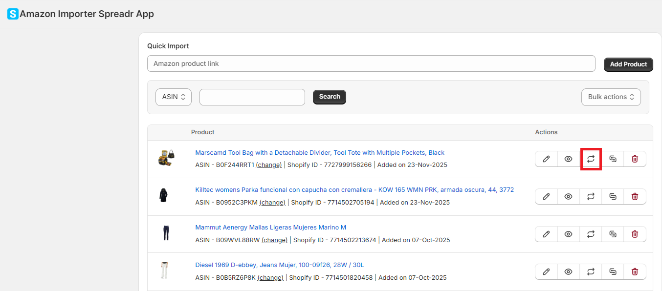 To manually sync any product search for the product in the Spreadr dashboard and click 'Sync'.